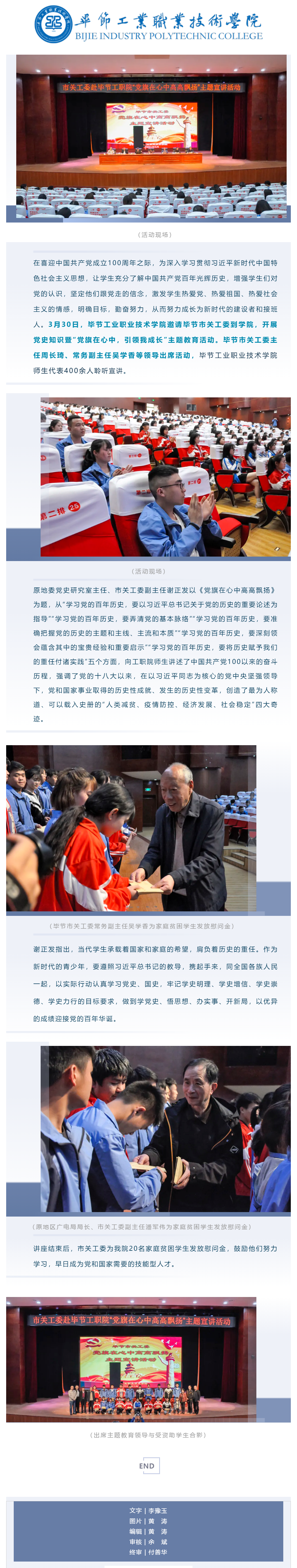 畢節(jié)工業(yè)職業(yè)技術(shù)學(xué)院邀請畢節(jié)市關(guān)工委到學(xué)校開展黨史知識(shí)暨“黨旗在心中,引領(lǐng)我成長”主題教育活動(dòng)