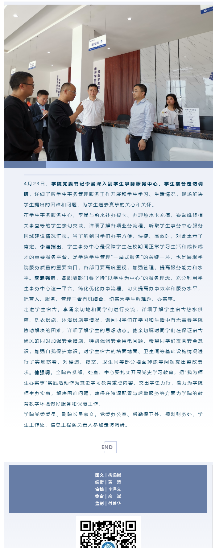 突出學(xué)史力行,為學(xué)生辦實(shí)事解難題 ——畢節(jié)工職院黨委書(shū)記李涌到學(xué)生事務(wù)服務(wù)中心、 學(xué)生宿舍走訪調(diào)研