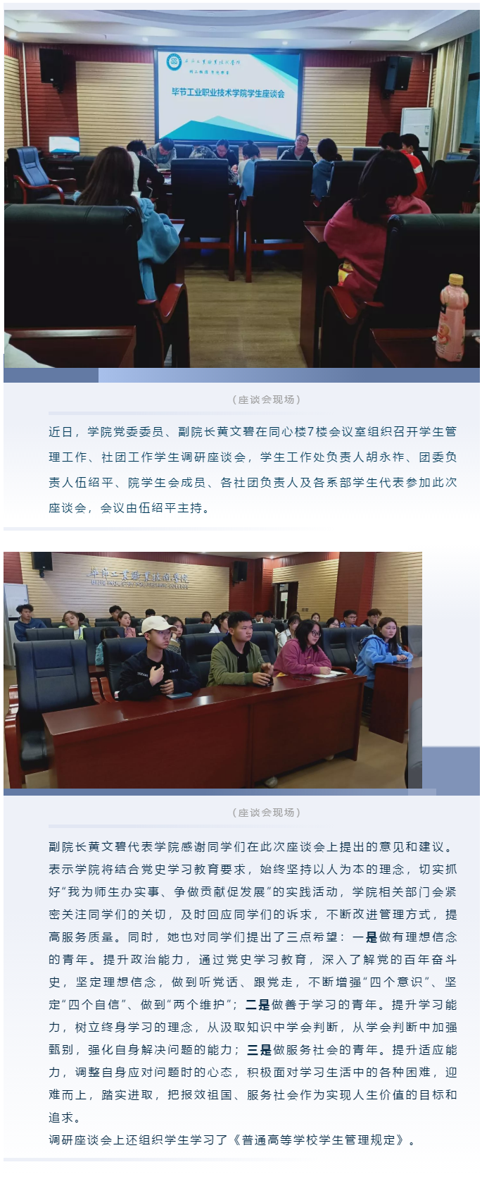 我為師生辦實事、爭做貢獻促發(fā)展——畢節(jié)工業(yè)職業(yè)技術(shù)學(xué)院召開學(xué)生調(diào)研座談會