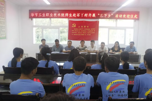 ▲畢節(jié)工業(yè)職業(yè)技術(shù)學院師生赴石丫村開展“三下鄉(xiāng)”活動歡迎儀式暨村干部為實踐隊員上入村第一課