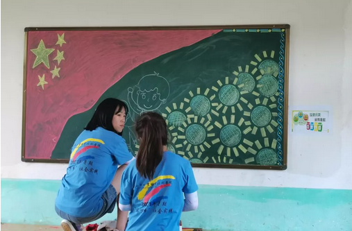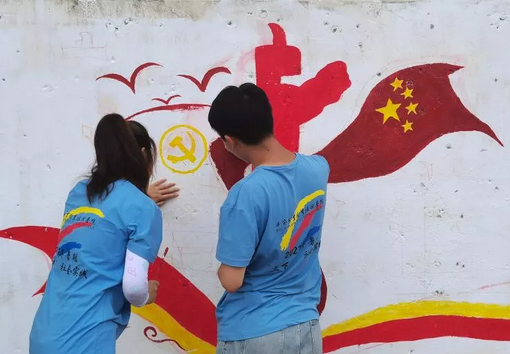在為期10天的“三下鄉(xiāng)”社會實踐中,實踐隊員們把黨史學習教育帶到了田間地頭家中墻上。實踐隊員們走進田間地頭,和當?shù)剜l(xiāng)親們一起學習交流黨的發(fā)展歷程,到家中聆聽當?shù)亍罢稀焙屯宋槔媳?、老黨員講述他們的親身經(jīng)歷和黨的光輝歷程并宣傳黨的政策,與鄉(xiāng)親們一起溝通鄉(xiāng)村振興的意見和建議。同時,實踐隊員們還將黨的光輝歷史和黨的政策、生態(tài)文明建設(shè)、鄉(xiāng)村振興、惠農(nóng)政策等用墻繪的方式畫在墻上。“實踐隊員們通過這種樸實、接地氣、通俗易懂的方式將黨史學習教育和黨的政策送到了田間地頭、村民家中,打破了傳統(tǒng)的宣講模式,增強了廣大村民振興鄉(xiāng)村的信心?!笔敬羼v村書記明正興說。