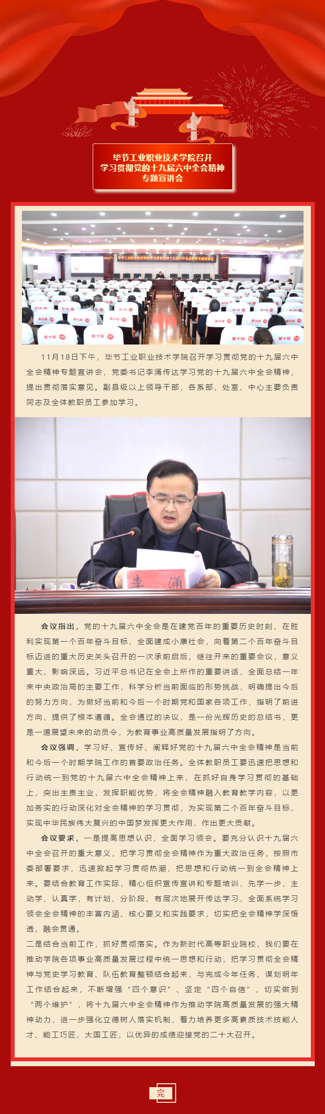 畢節(jié)工業(yè)職業(yè)技術(shù)學(xué)院召開學(xué)習(xí)貫徹黨的十九屆六中全會(huì)精神專題宣講會(huì)