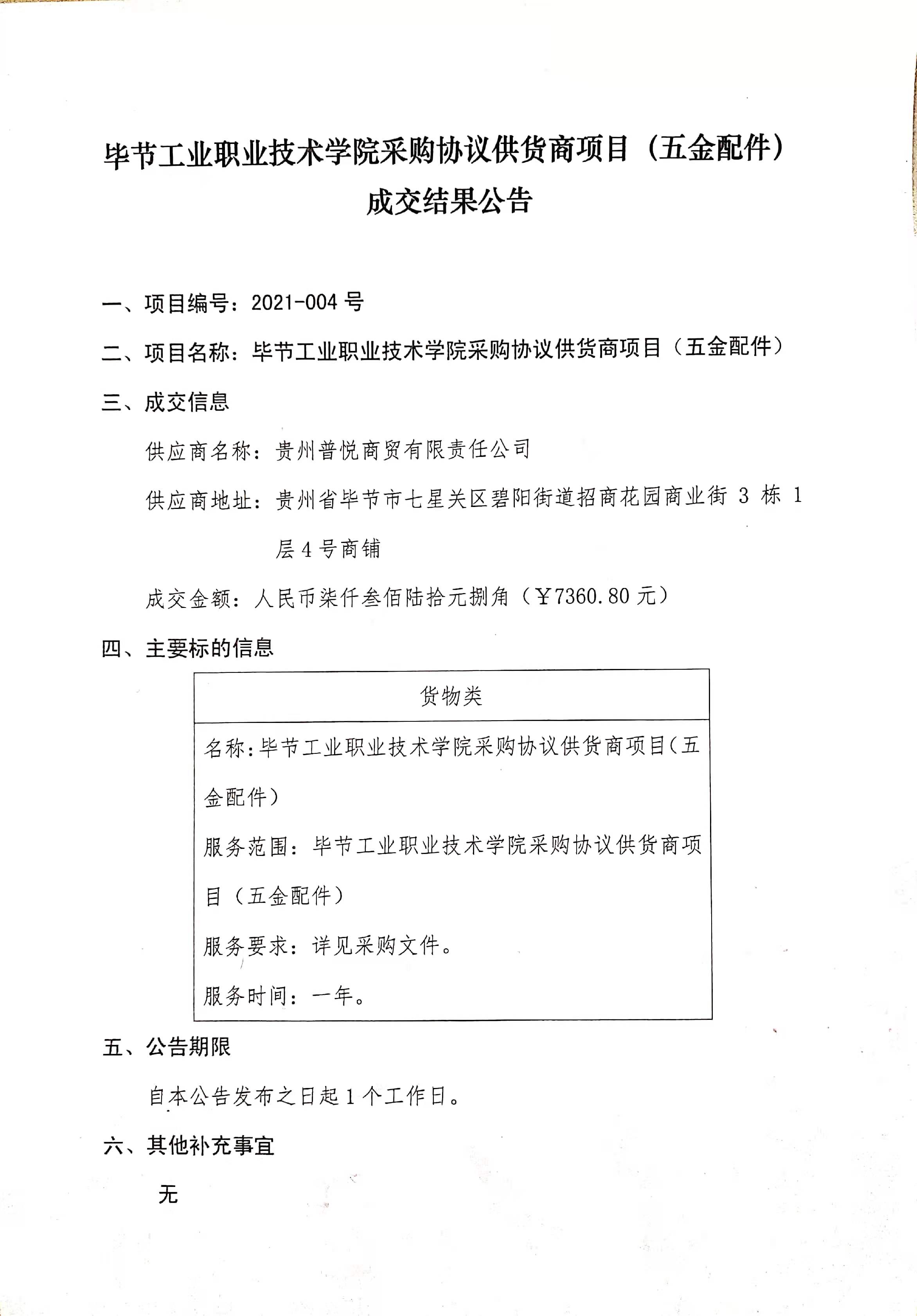畢節(jié)工業(yè)職業(yè)技術(shù)學(xué)院采購(gòu)協(xié)議供貨商項(xiàng)目(五金配件)成交結(jié)果公告