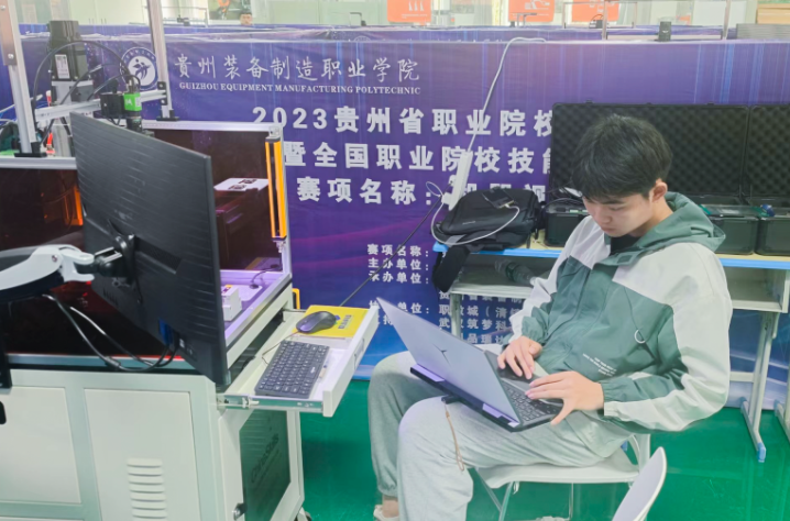 (張朝、田鳳老師指導(dǎo)的學(xué)生陳向東在機(jī)器視覺(jué)系統(tǒng)應(yīng)用項(xiàng)目比賽現(xiàn)場(chǎng))